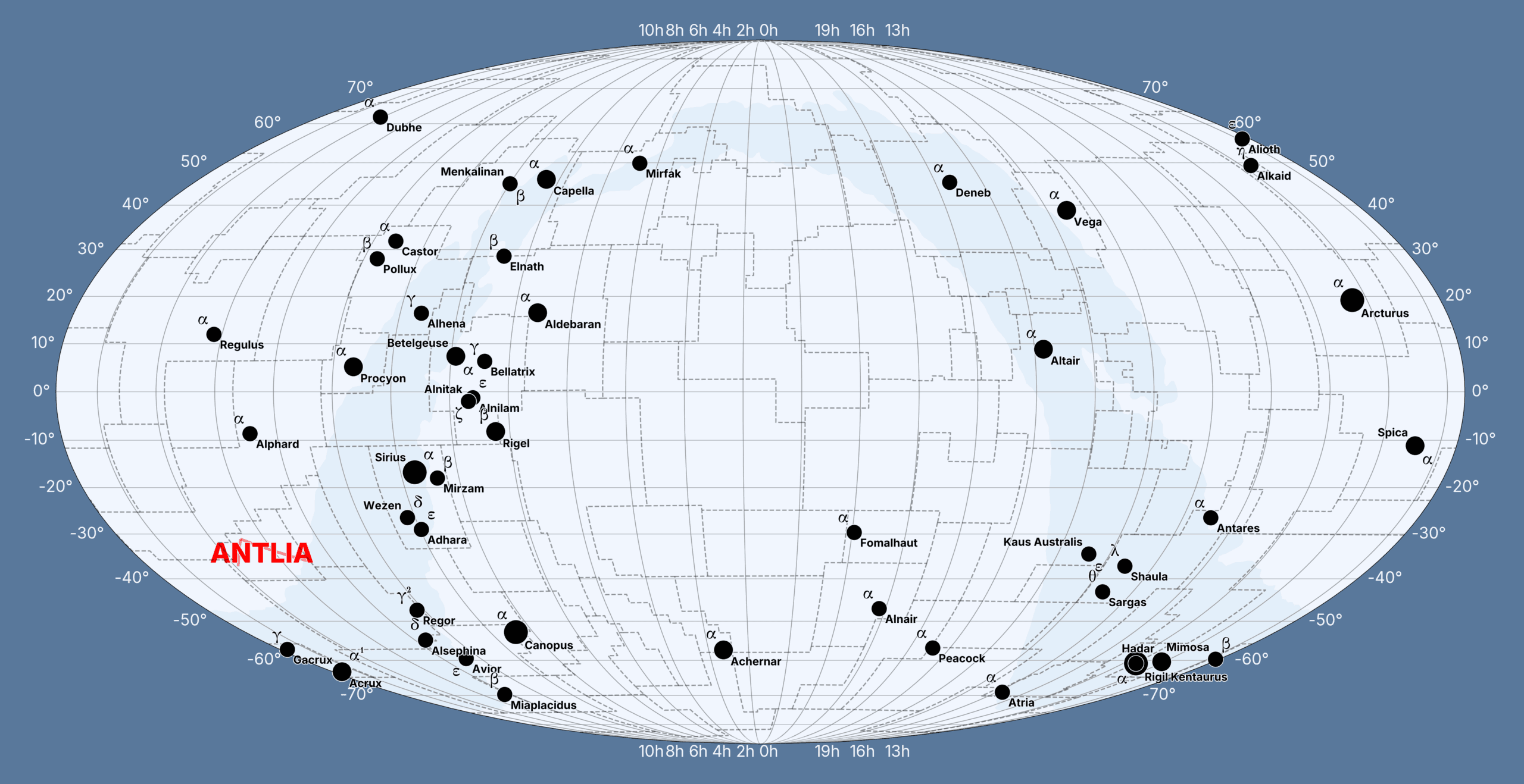 | Ant | Antlia (Máquina Neumática) | Antliae | Sur | Moderno (Lacaille) |