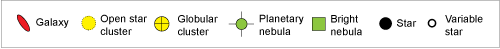 Centrado en la constelación, contiene objetos de los catálogos Messier, NGC e IC. Estrellas hasta magnitud 6.