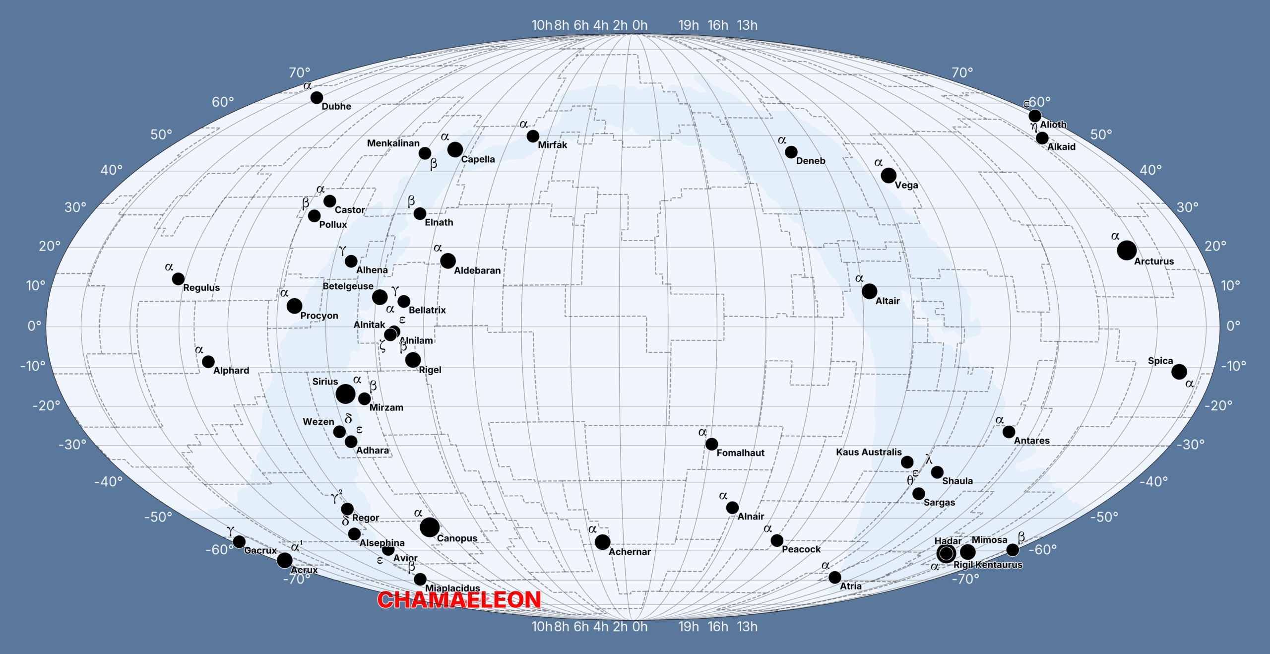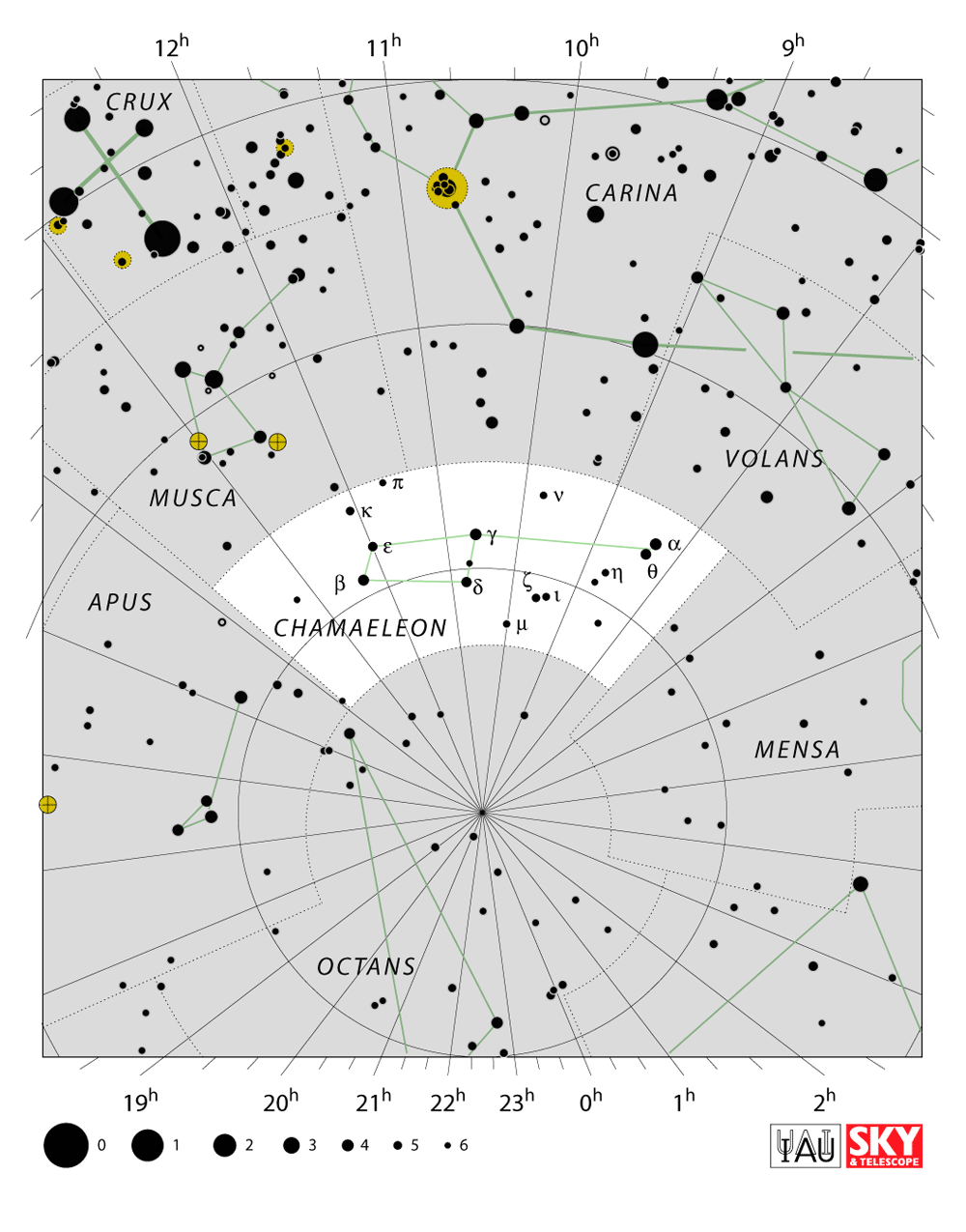 | Cha | Chamaleon (Camaleón) | Chamaeleontis | Sur | Moderno (Plancius) |
