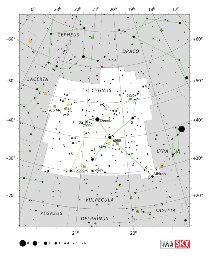 Es la constelación nro 16 por su tamaño. Ocupa un total de 803.98 grados en el cielo, equivalente al 1.9% de éste.Su estrella más brillante es Deneb, de magnitud visual 1.30.
