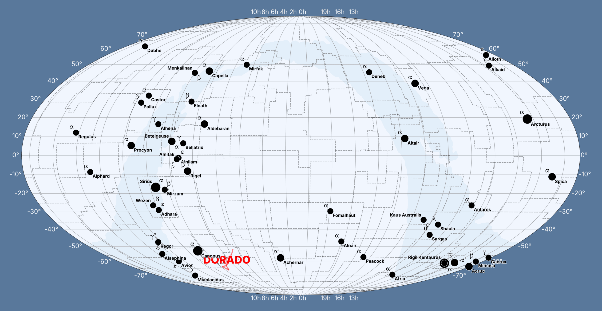 | Dor | Dorado (Pez Dorado) | Doradus | Sur | Moderno (Lacaille) |