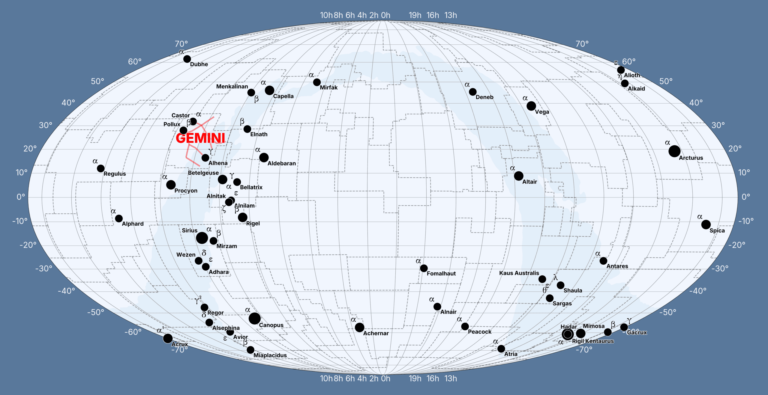 | Gem | Gemini (Gemelos) | Geminorum | Norte | Antiguo (Ptolomeo) |