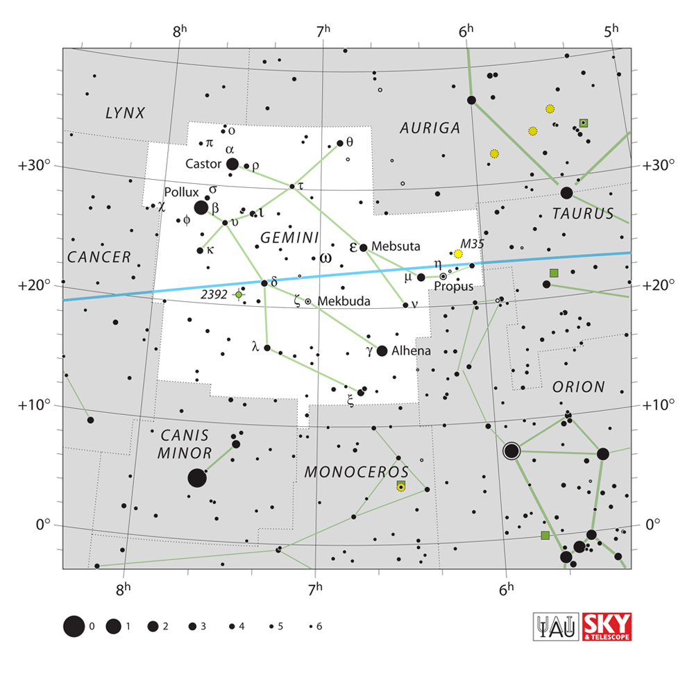 Es la constelación nro 30 por su tamaño. Ocupa un total de 513.76 grados en el cielo, equivalente al 1.2% de éste.Su estrella más brillante es Pollux, de magnitud visual 1.29.