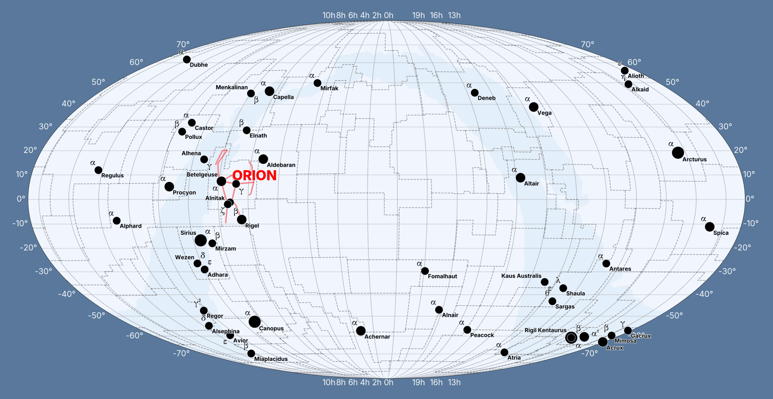 | Ori | Orion (Orión) | Orionis | Norte | Antiguo (Ptolomeo) |