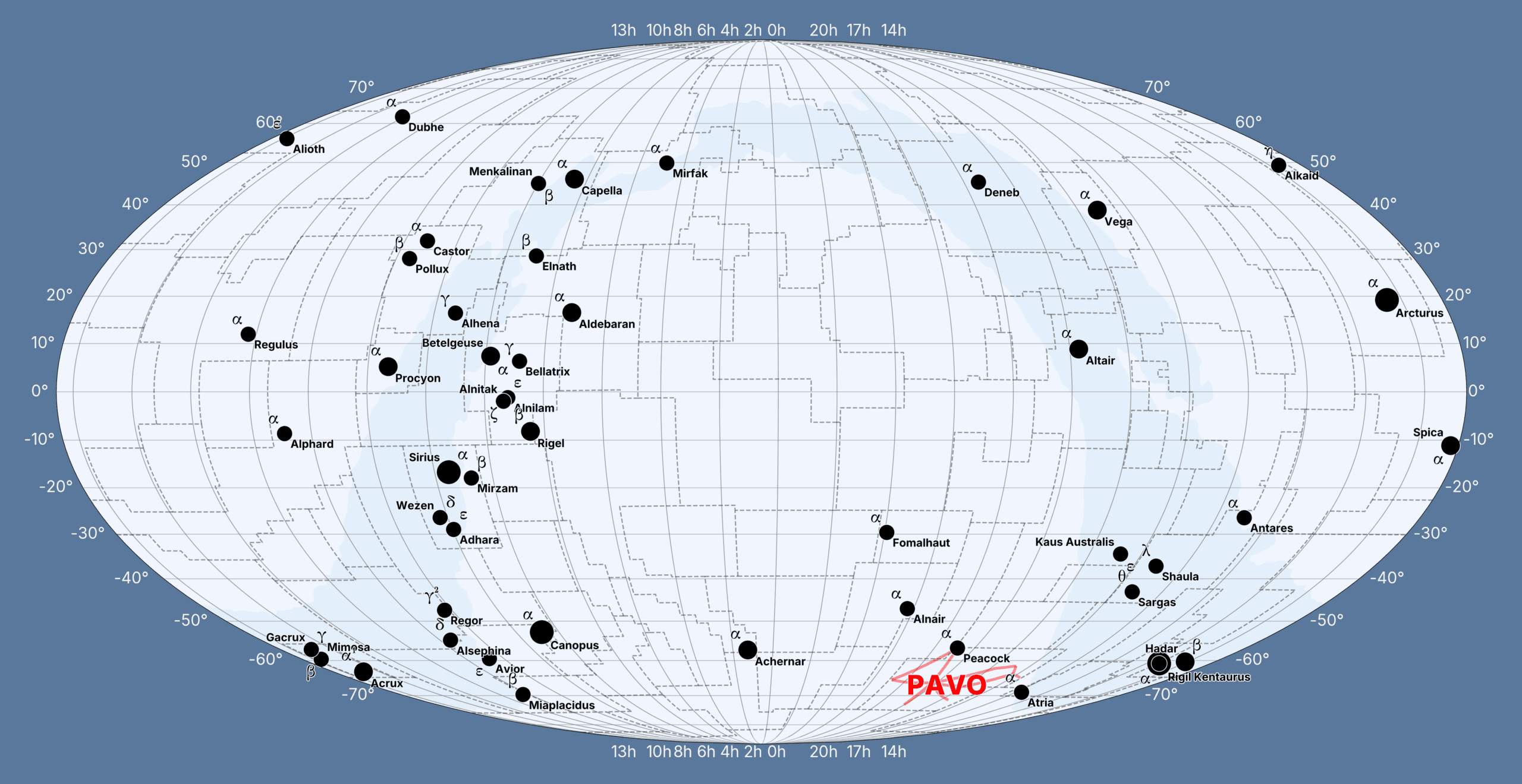 Su estrella más brillante es Peacock, de magnitud visual 1.86.