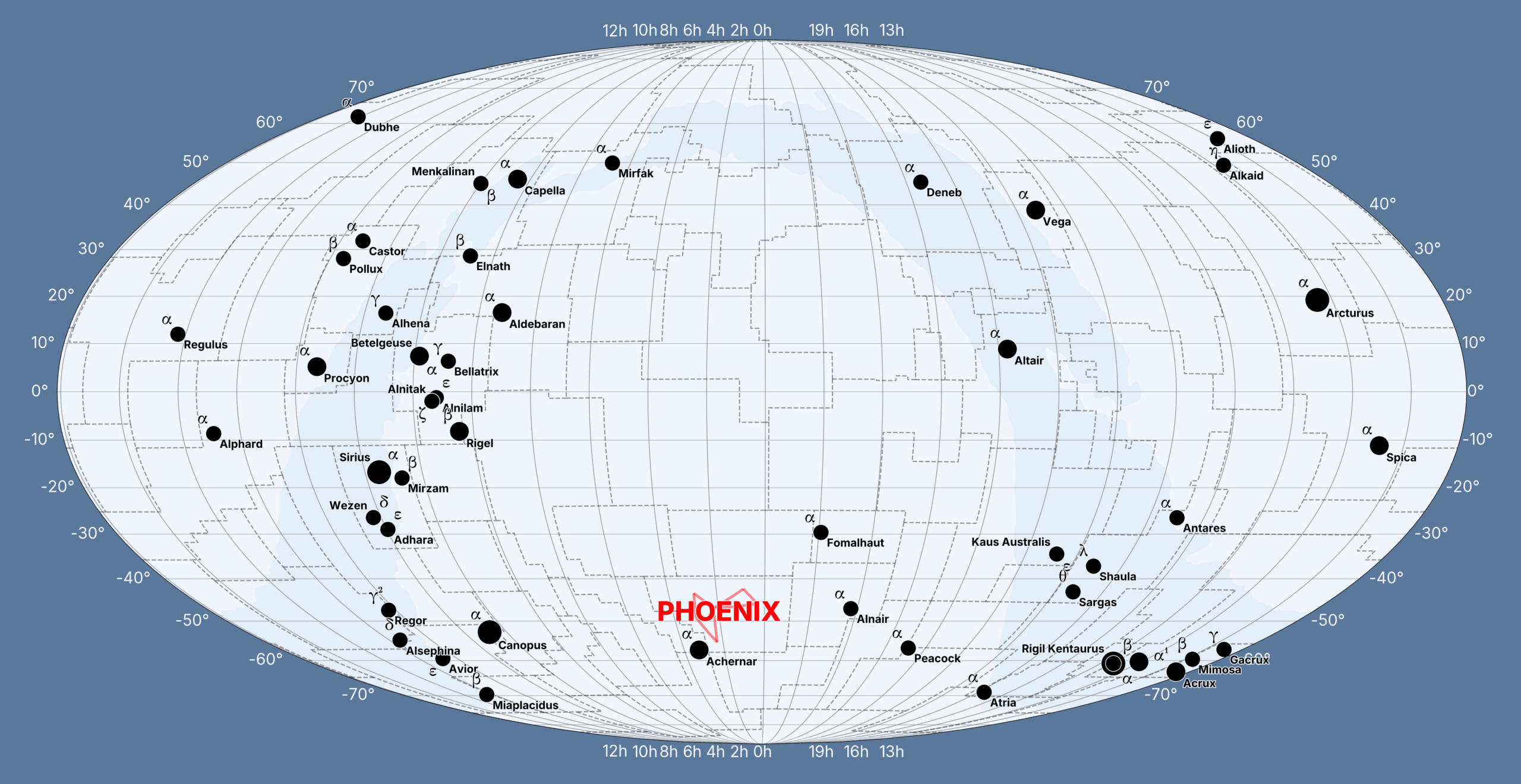 | Phe | Phoenix (Ave Fenix) | Phoenicis | Sur | Moderno (Keyser y Houtman) |