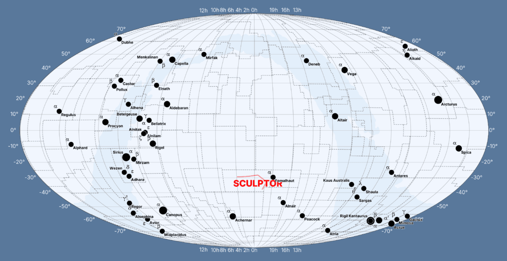 La constelación tiene varios objetos interesantes, destacándose NGC-253, conocida como la galaxia de Sculptor o Galaxia Moneda de Plata.