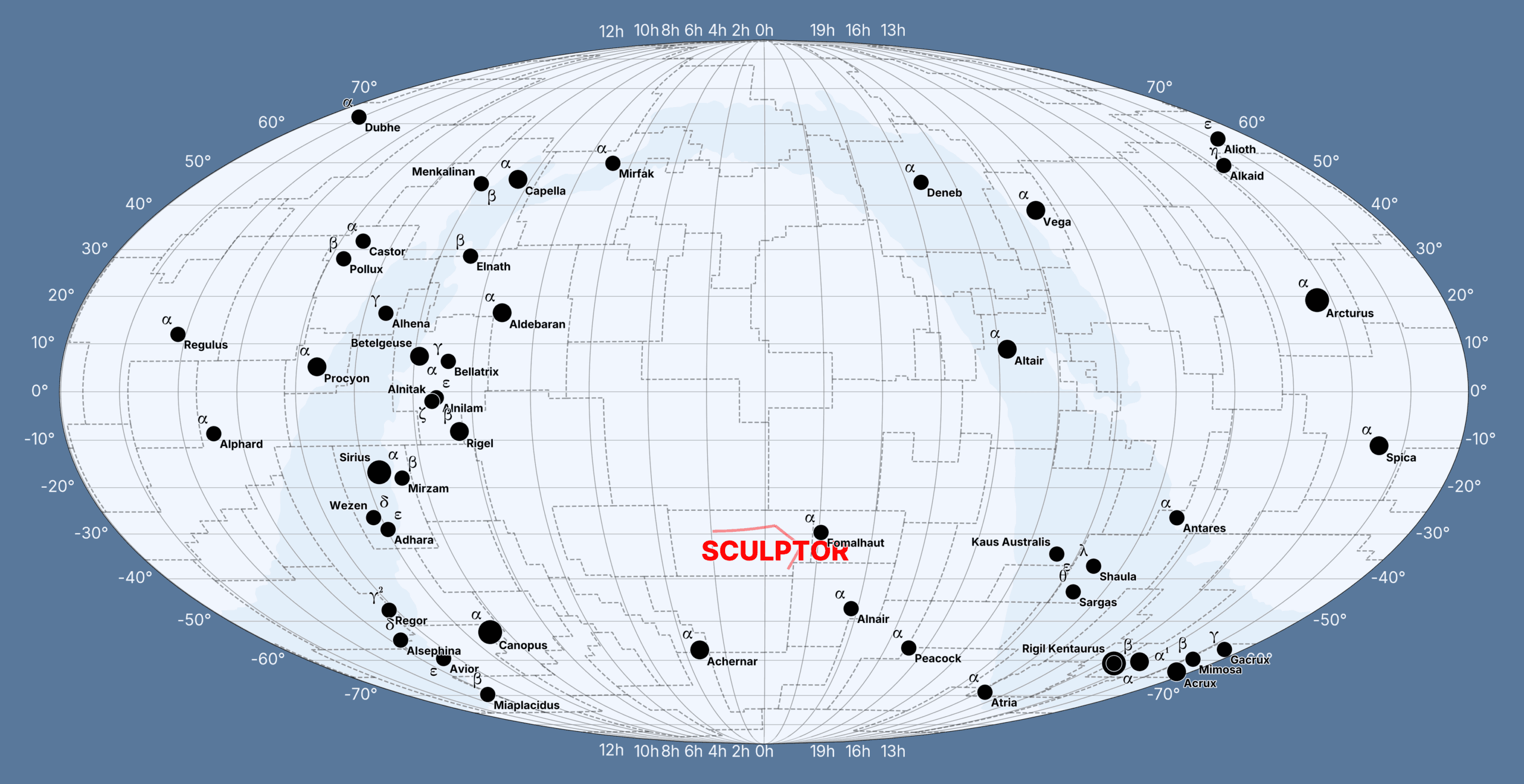 | Scl | Sculptor (Escultor) | Sculptoris | Sur | Moderno (Lacaille) |