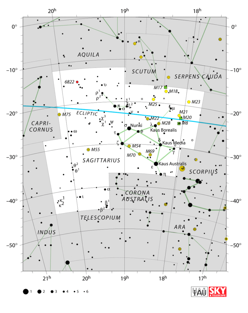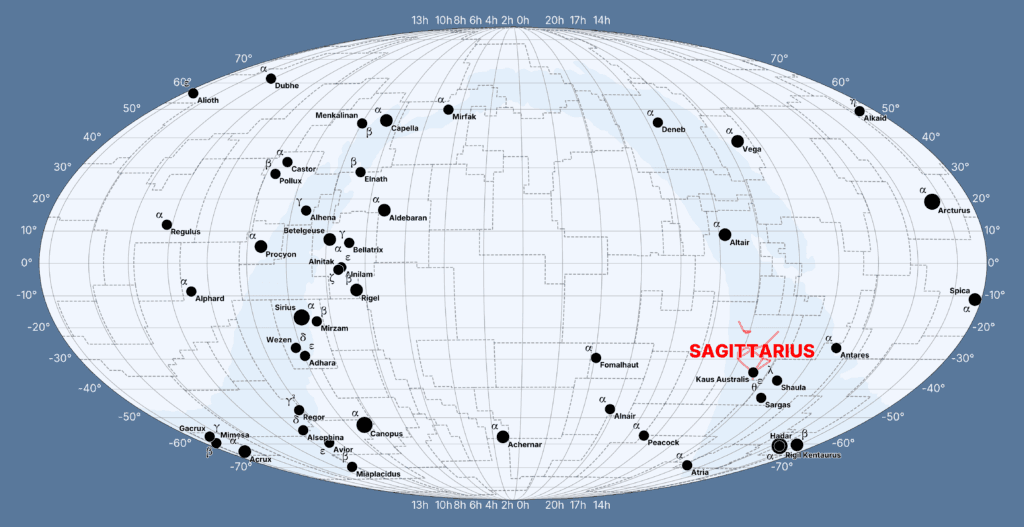 Es la constelación nro 15 por su tamaño. Ocupa un total de 867.43 grados en el cielo, equivalente al 2.1% de éste.Su estrella más brillante es Kaus Australis, de magnitud visual 1.80.