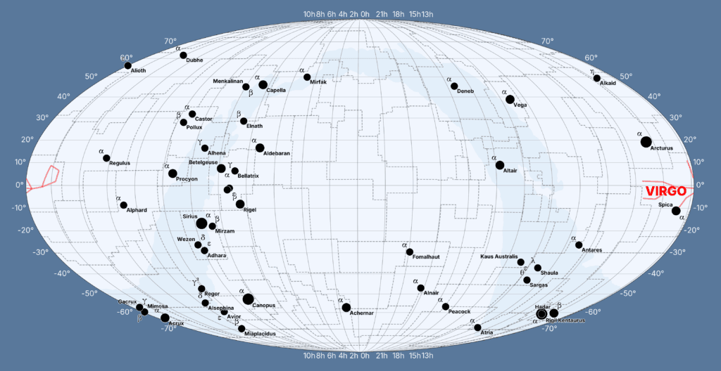 Es la constelación nro 2 por su tamaño. Ocupa un total de 1294.43 grados en el cielo, equivalente al 3.1% de éste.Su estrella más brillante es Spica, de magnitud visual 0.89.